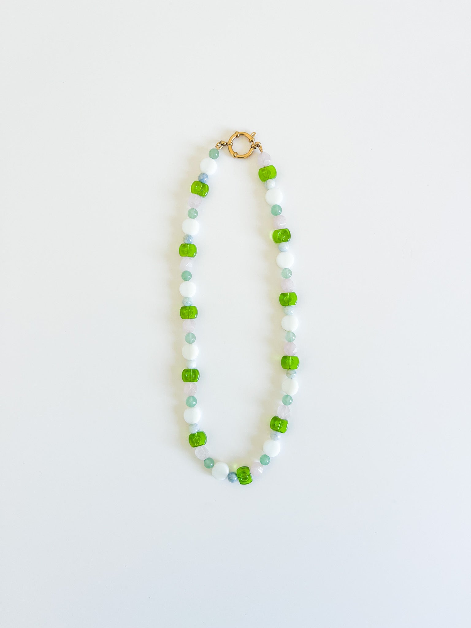 Soft blush rose quartz and green glass beads used together to create a fresh, soft, and summery piece.